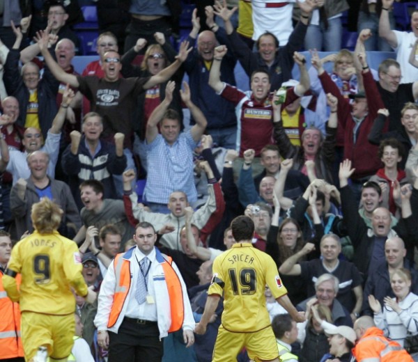 If this has worked I'm the bloke with the white hair wearing our home shirt just to the left of Tom Heaton's face. This photo was in the Times football section the Monday morning after the game.
